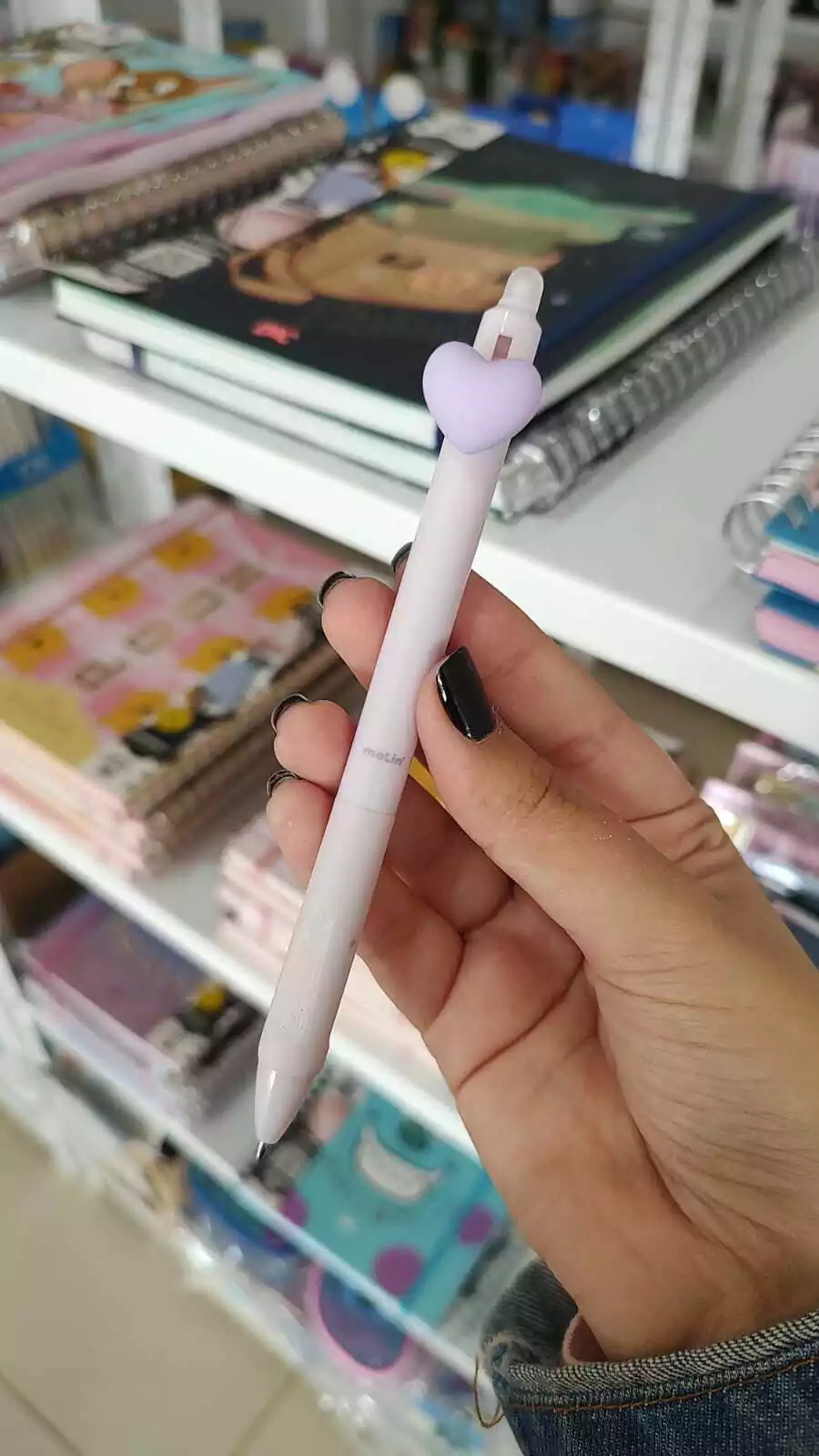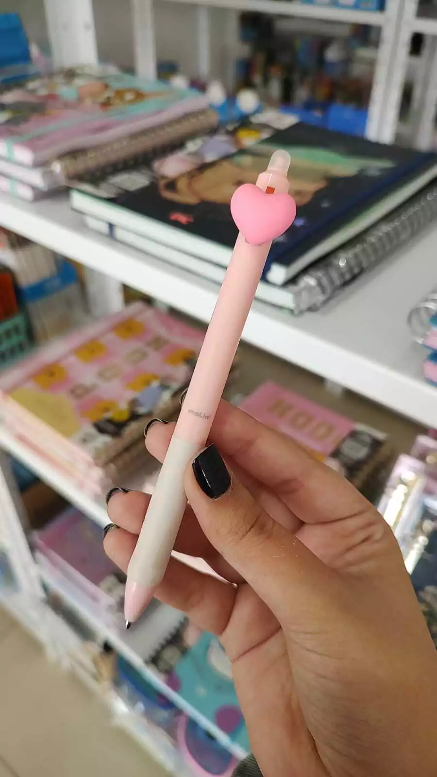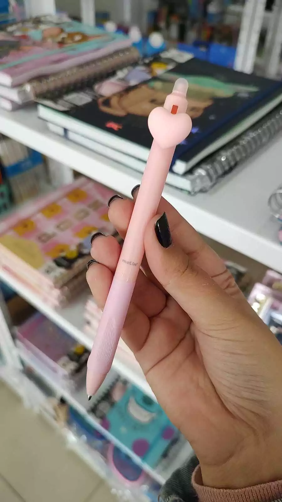 Essa caneta esferográfica retrátil 0.7mm tem tinta preta, grip emborrachado para escrita confortável e um detalhe encantador: o acionamento da ponta é feito ao pressionar o coração na parte superior!