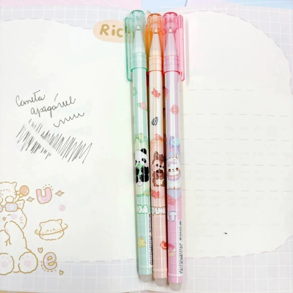 A Caneta Apagável Modelo Pets traz estampas adoráveis de gatinho, esquilo e panda em um corpo ilustrado cheio de personalidade. Com clip para pendurar e tinta preta em gel, ela garante escrita macia e apagável por fricção — sem corretivo e sem sujeira!