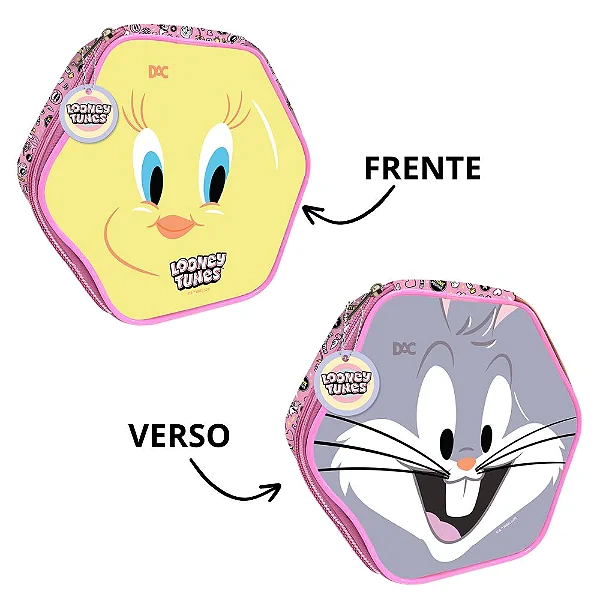 Este estojo espaçoso e prático é perfeito para guardar seus materiais escolares, acessórios, carregadores, produtos de higiene pessoal e muito mais. Com seu formato hexagonal exclusivo e estampa vibrante dos personagens icônicos de Looney Tunes, ele vai te acompanhar em todos os momentos com estilo e diversão.